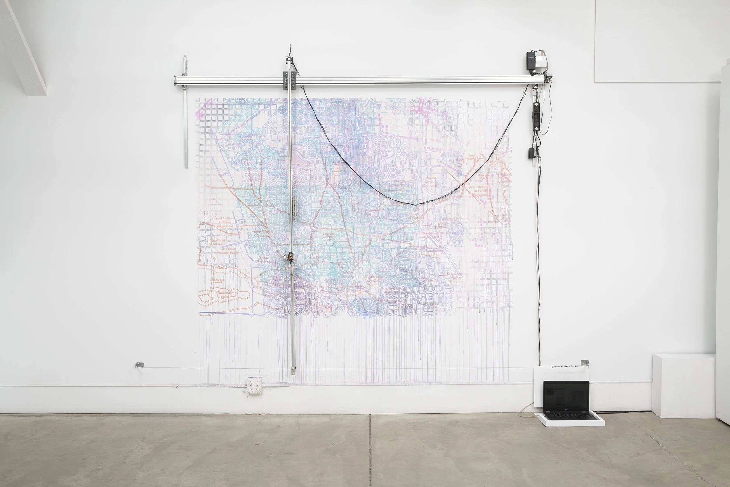GIS-processed satellite data, generative drawing machine on wall