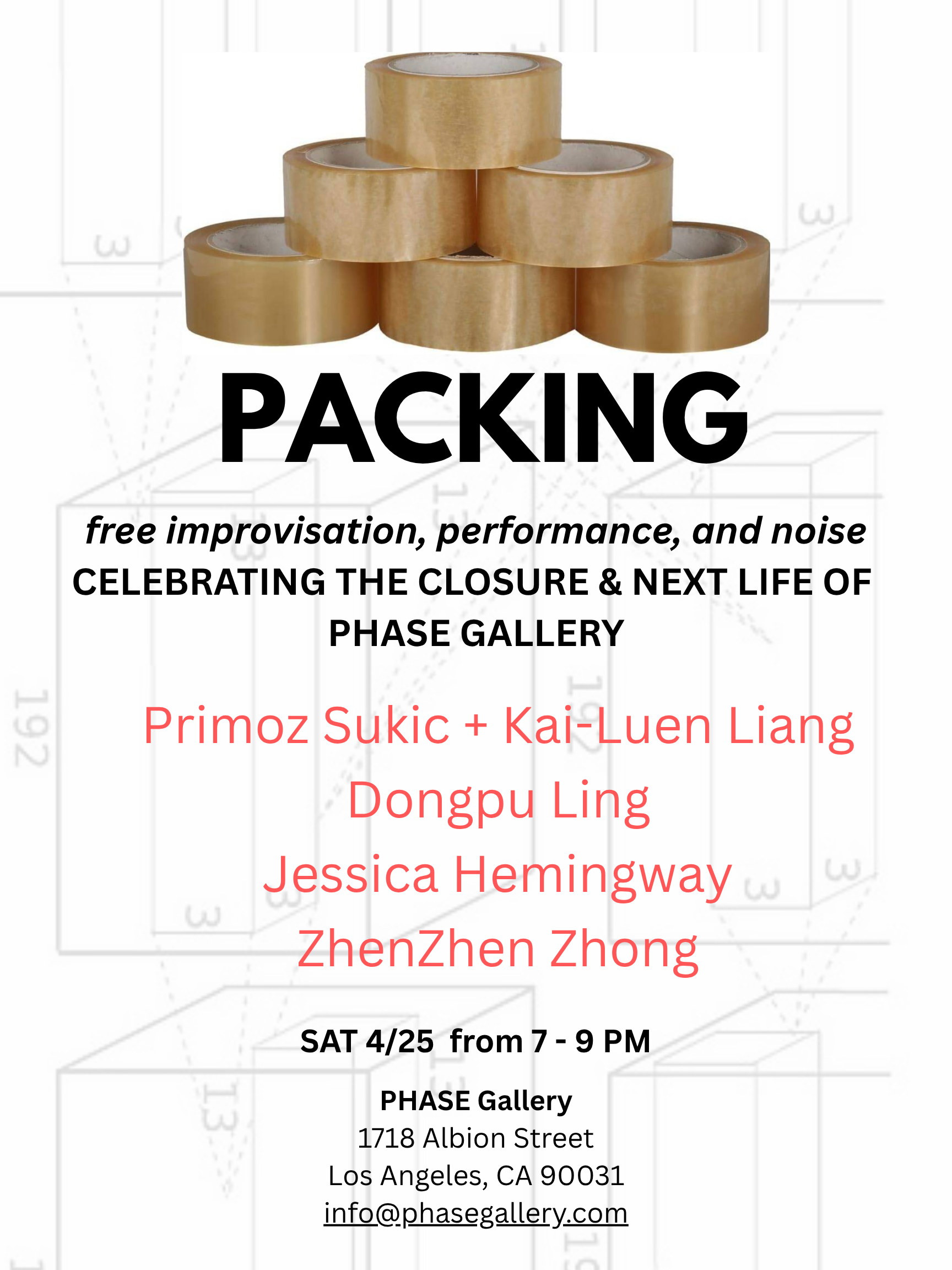 Dear Friends, Come celebrate with us the completion of the current incarnation of Phase Gallery. We will be hosting free improvisation and performance from the artists: Primoz Sukic + Kai-Luen Liang, Dongpu Ling, Jessica Hemingway and ZhenZhen Zhong! @kailue n3030 @primo zsukic @germ anhe mingway @zhen_zh en_zhon g @xest ax It will include the closing of the current exhibition e/crite-s, with Hu Di, David Jang, Michele Lorusso, Mieke Marple, (A)Provisional-Collective, Xi Qin and Yixuan Tan. @hudi_la_ @ michelelorus so @miekemar p le @davidb umjang @qi nx i_art @yixua n_tan_ We greatly appreciate all these years of engagement, exchange, conversations and art at this incredible location in Lincoln Heights, LA. See you later! ❤️PHASE